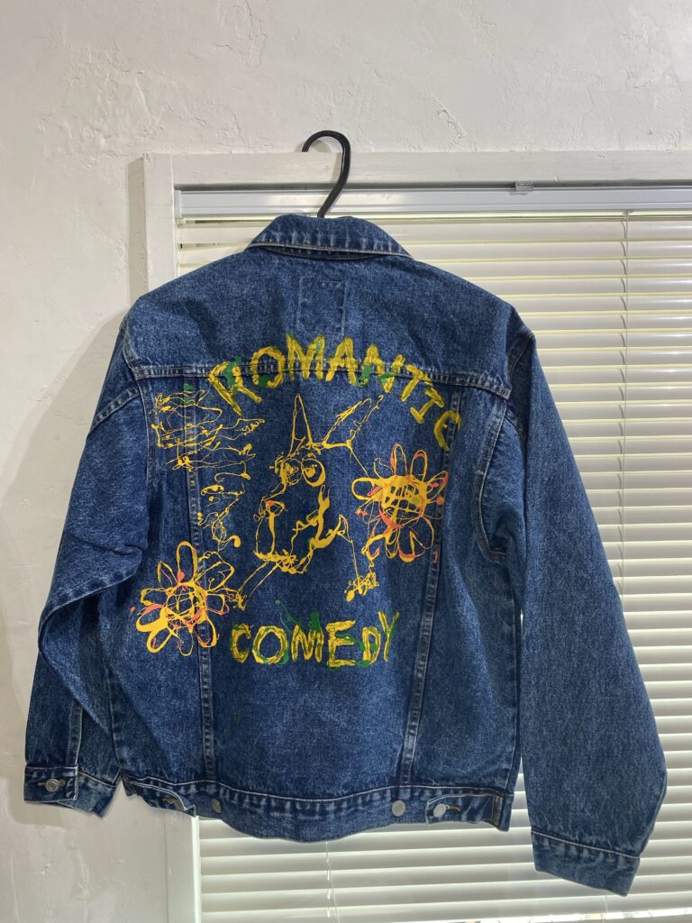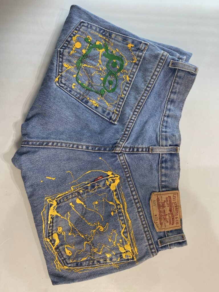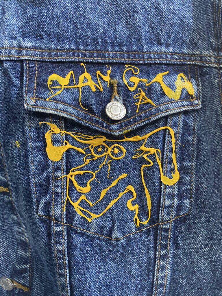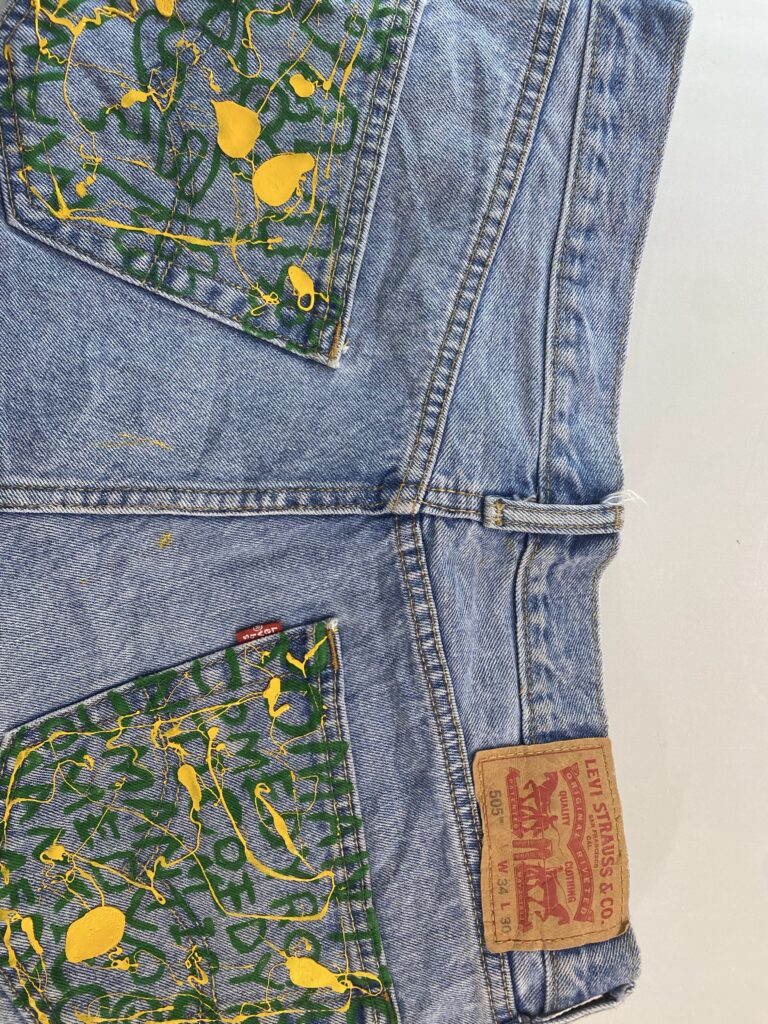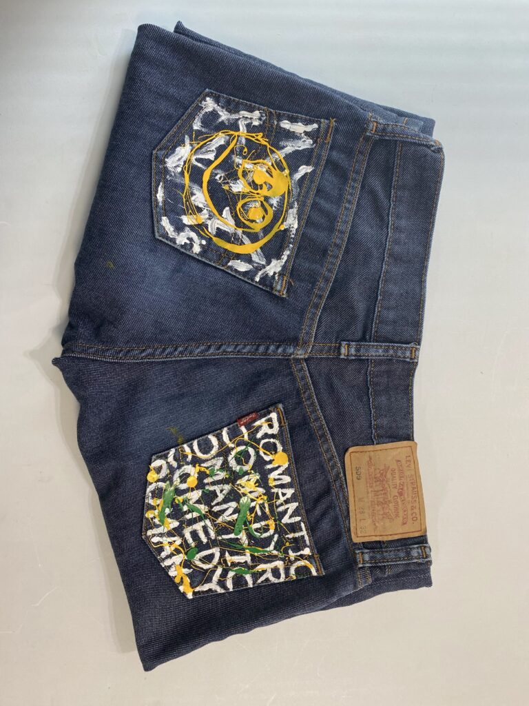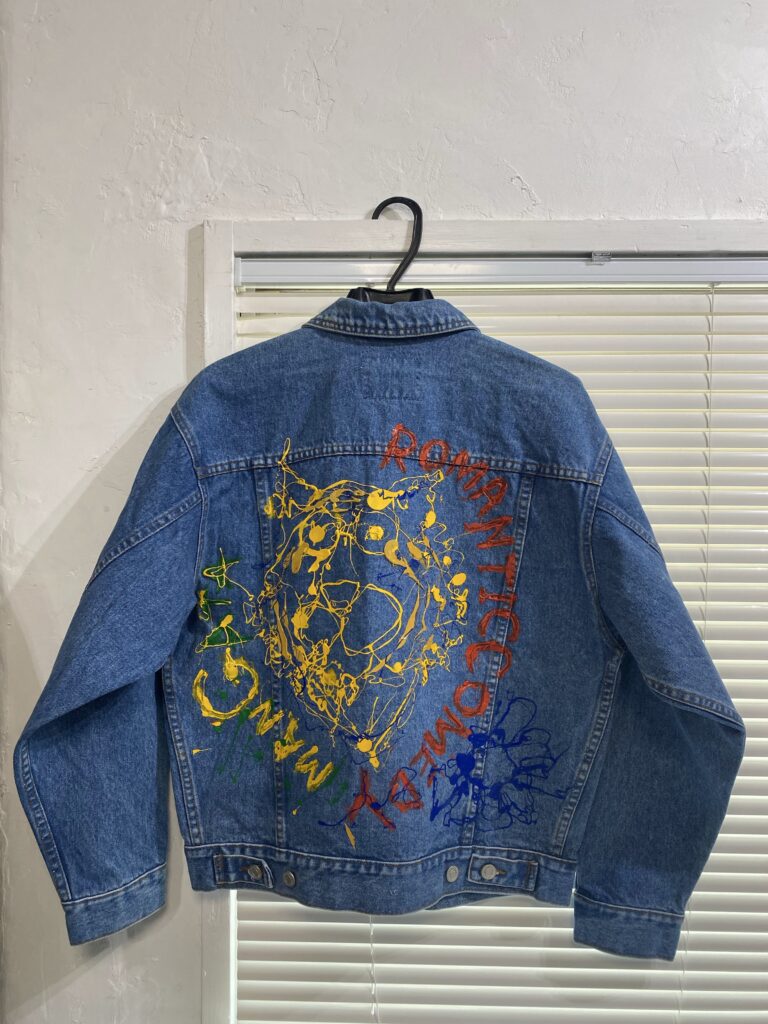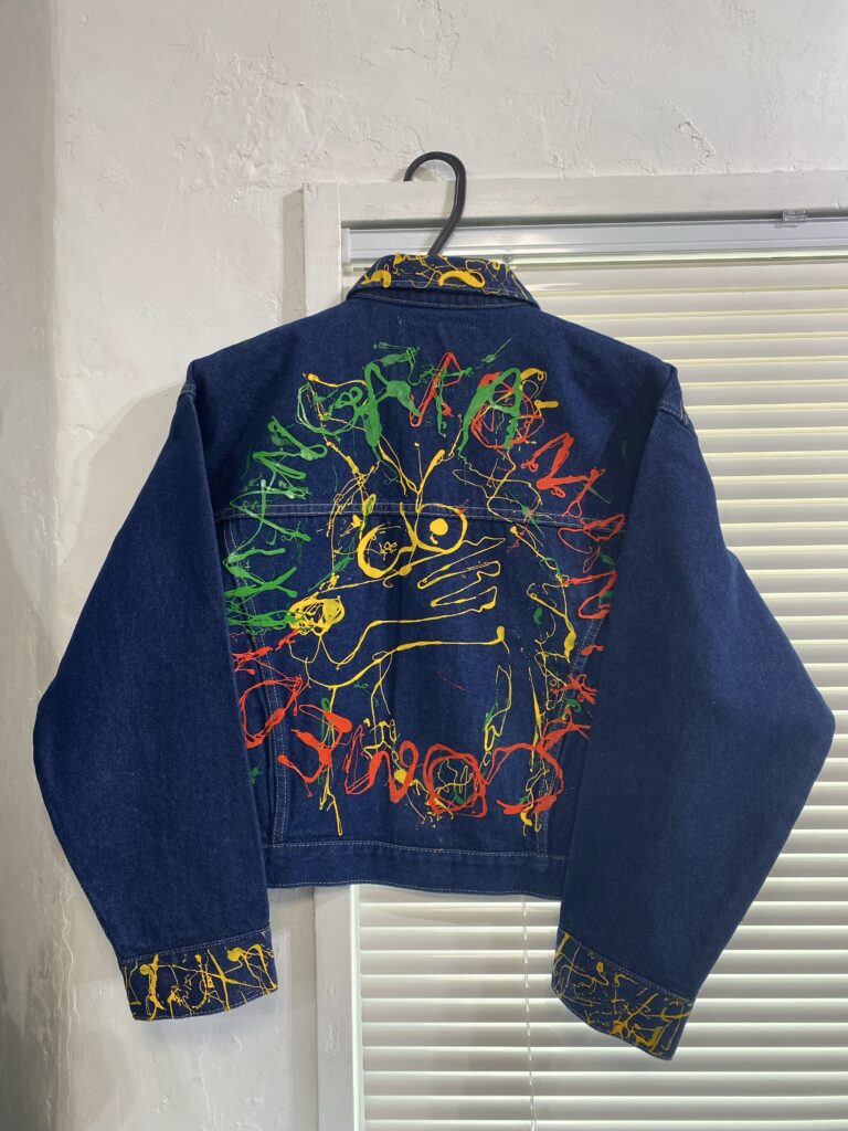 シルクスクリーンで使用しているインクをあえて“垂らす”ことで生まれる偶然の表情。ボディにはデニムを使用し買い付けから加工、ペイントまですべて手作業で仕上げた一点物になります。